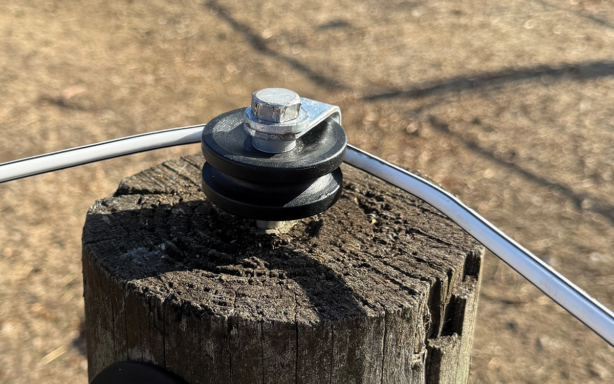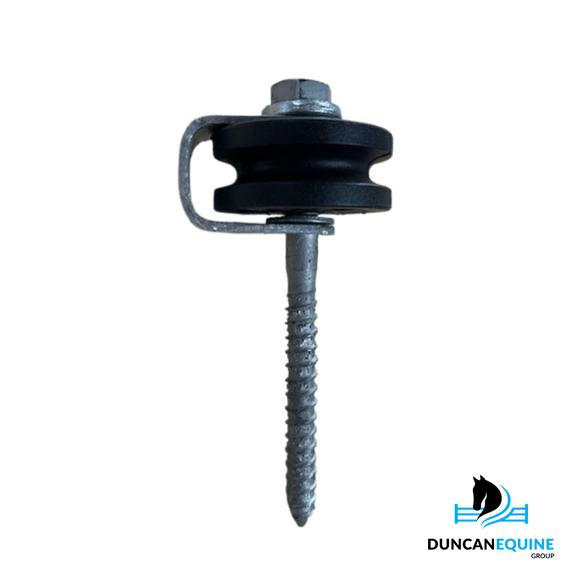 Insulated heavy duty coach screw with roller on top. Allows the coated wire to run continuously around bends of more than 45 deg. Used on top of timber post.